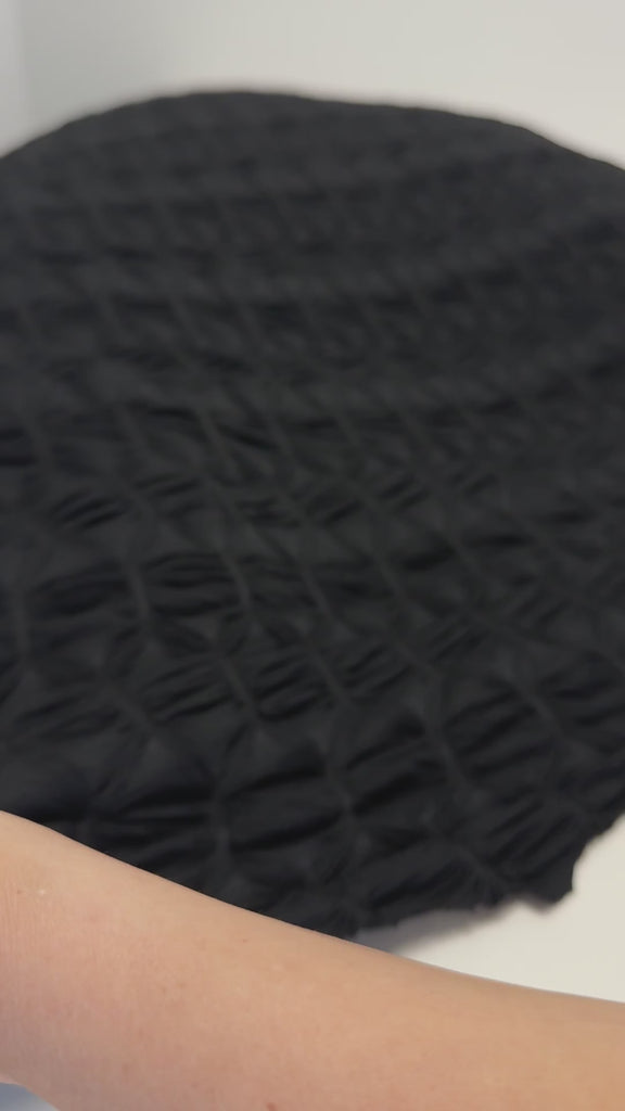 Our Black Premium Quality Textured Diamond Jacquard Fabric is perfect for creating standout garments and décor! Featuring a 3D ruched diamond pattern, this fabric is soft, slightly stretchy, and adds beautiful texture to any design.